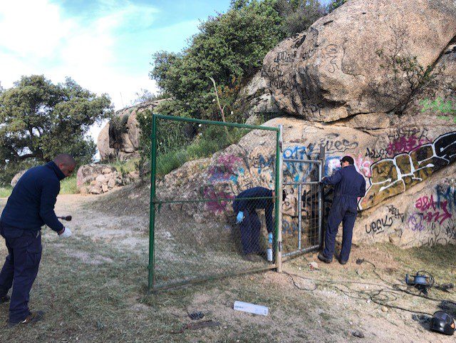 También se está procediendo a la eliminación de pintadas sobre rocas en esta zona. Al tratarse de una zona de alto valor ambiental no se pueden utilizar productos químicos como decapantes, por lo que se está utilizando hidrolimpiadora con chorro de arena.