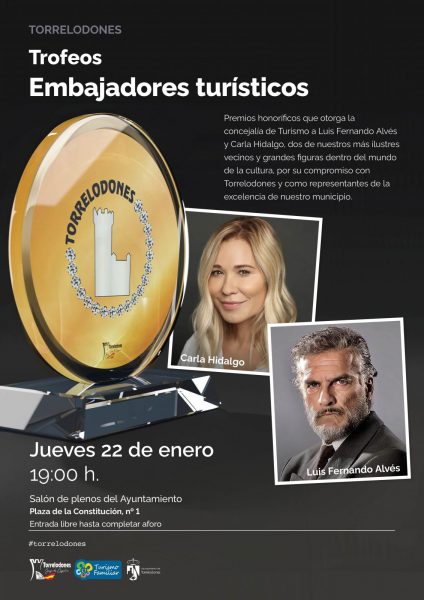 La Concejalía de Turismo de Torrelodones organiza para el próximo jueves 22 de enero un reconocimiento a dos vecinos del municipio: el actor Luis Fernando Alvés y la actriz y presentadora Carla Hidalgo. Por ser dos grandes figuras de la cultura dentro del municipio, ambos recibirán el título de embajadores turísticos de Torrelodones en una gala que tendrá lugar en el Salón de Plenos del Ayuntamiento, a partir de las 19:00 h, con entrada libre hasta completar aforo.