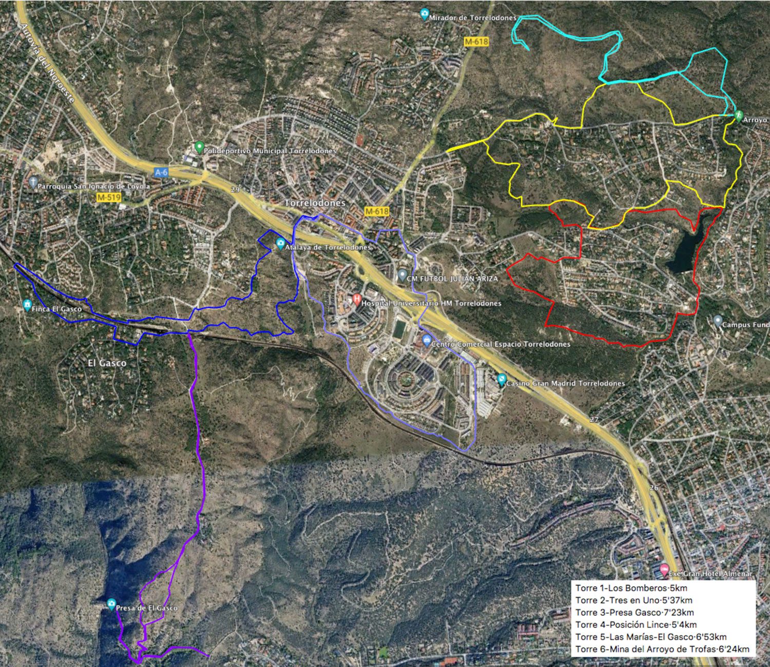 INICIO: Ayto de Torrelodones. RECORRIDO: puente de la A6, Arroyo de la Torre, Punto Limpio, C/ Arroyo de los Viales, C/ Sitio del Marillejo, C/ Herrén de Madrid, puente A6, campo de fútbol Julián Ariza, C/ Daniel Jiménez, C/ Real, Ayuntamiento.