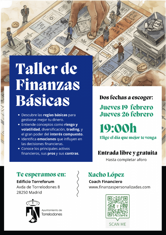 La Concejalía de Desarrollo Local de Torrelodones, en colaboración con finanzaspersonalizadas.com organiza un taller de Finanzas Básicas dirigido a todos los vecinos interesados en mejorar la gestión de su economía personal. La actividad se desarrollará en Torreforum (avenida de Torrelodones, 8) y contará con dos fechas a elegir: jueves 19 de febrero y jueves 26 de febrero, ambas a las 19:00 horas. La asistencia es libre y gratuita hasta completar aforo.