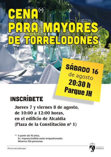 Todos aquellos mayores que quieran asistir a la cena deberán tener 70 años o más y estar empadronado en Torrelodones. La hoja de inscripción se recogerá en el edificio de Alcaldía (Plaza de la Constitución 1), los días 7 y 8 de agosto, de 10:00 a 12:00 horas.