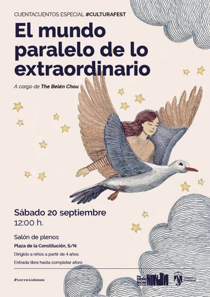 El segundo cuentacuentos se celebrará el sábado 20 de septiembre, a las 12:00 horas, en el Salón de Plenos (Plaza de la Constitución, 1). Está incluido en las propuestas culturales que llegan con la Feria #CulturaFest. Bajo el título El mundo paralelo de lo extraordinario, la narradora The Belén Chou ofrecerá un cuentacuentos lleno de imaginación y aventuras, dirigido a niños de 4 años en adelante. La entrada será libre hasta completar el aforo disponible.