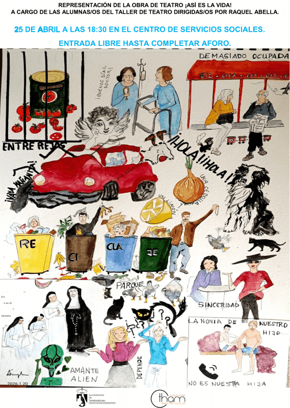 Además, la agenda cultural de la semana en Torrelodones incluye la representación, por parte de las alumnas de los grupos de teatro de la THAM, de la obra «¡Así es la vida!». Será el próximo sábado 25 de abril, en horario de 18:30 a 20:00 h. La función, dirigida a todo tipo de público, tendrá lugar en el Centro de Servicios Sociales de Torrelodones con entrada gratuita hasta completar aforo.