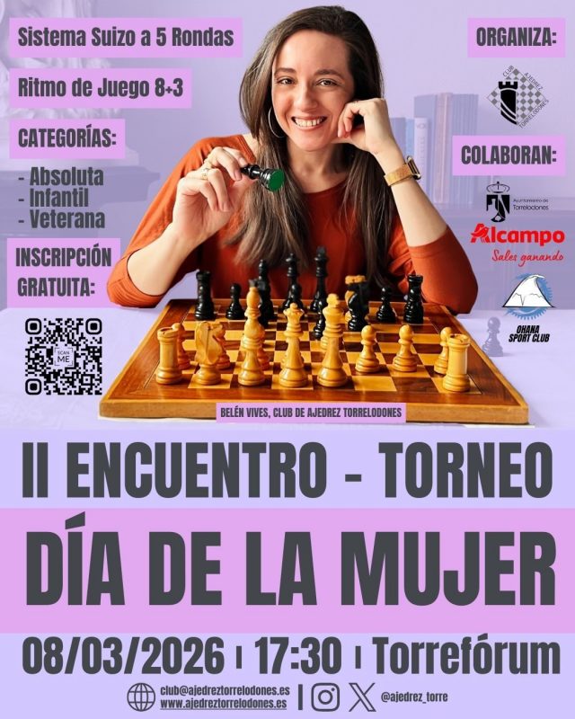 Completan el domingo, Día Internacional de la Mujer, torneos de voleibol, ajedrez y baloncesto. A las 13:00 h., será el partido de segunda división cadete preferente de voleibol, con la participación de CV Torre y Coslada vóley A, en el Polideportivo José Antonio Mur Capelo.