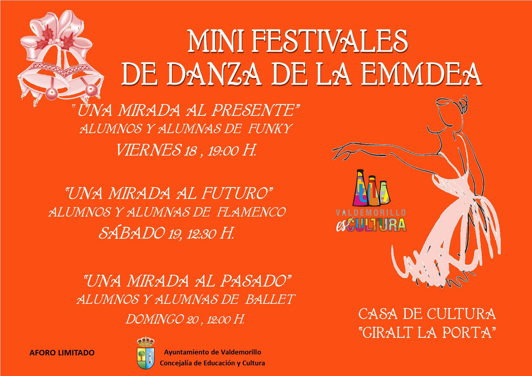Con la música igualmente como principal protagonista, este sábado 12 a las 19,00 horas, se celebrará el primero de los minifestivales en cartel, elevando las notas de la Orquesta y Big Band de la EMMDEA. El testigo lo tomará la danza, en sus más diversas disciplinas. Así, alumnas y alumnos de funky ofrecerán el viernes 18, a las 19:00 horas, ‘Una mirada al presente’, mientras que en la tarde del 19 será el alumnado de flamenco el que ponga sobre el escenario del Auditorio local, ‘Una mirada al futuro’, y ya al mediodía del domingo el minifestival de ballet cerrará estas actuaciones con ‘Una mirada al pasado’.
