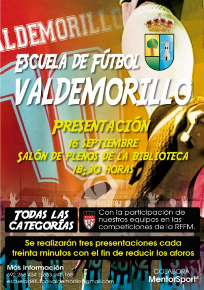 Valdemorillo cuenta ya con su propia Escuela de Fútbol, un proyecto necesario para dar respuesta a la gran afición que despierta este deporte y que, como señala el concejal Miguel Partida, “nos va a permitir formar equipos en todas las categorías y participar en las competiciones organizadas por la Real Federación de Fútbol de Madrid”. La escuela se presentó el pasado 16 de septiembre en el edificio María Giralt, contando para su desarrollo con MentorSport, empresa colaboradora de Alarro Gestión, cuyo responsable, David Baonza, es un gran conocedor de “la necesitad real que tiene una población como Valdemorillo de contar con este tipo de propuesta deportiva, de calidad, que permita que los menores no tengan que desplazarse a otros municipios”. Este proyecto nace además con el respaldo y asesoramiento técnico de un gran profesional como Julio García Mera, nombre muy destacado del fútbol sala español.