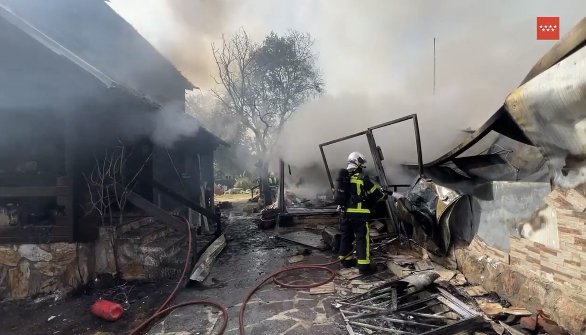 El incendio ha afectado a una caseta de unos 50 metros cuadrados y a la totalidad de una casa de madera de dos alturas. Hasta el lugar se han desplazado siete dotaciones de Bomberos de la Comunidad de Madrid, cuyos efectivos han controlado las llamas y han evitado que el fuego se propagase otra construcción también de madera, así como a otra vivienda en una parcela contigua.