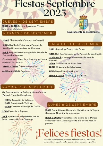 La alegría se prepara ya para tomar el centro urbano de Valdemorillo, convirtiendo su Plaza de la Constitución y calles cercanas en el escenario de los eventos programados por el Ayuntamiento con motivo de sus tradicionales Fiestas de Septiembre. Unas celebraciones que, como insiste en destacar el regidor, “tienen como objetivo despertar la participación de todos, niños, jóvenes y adultos, para disfrutar juntos de la diversión y el gran ambiente que vamos a vivir un año más para ponerle el mejor de los broches al verano”.