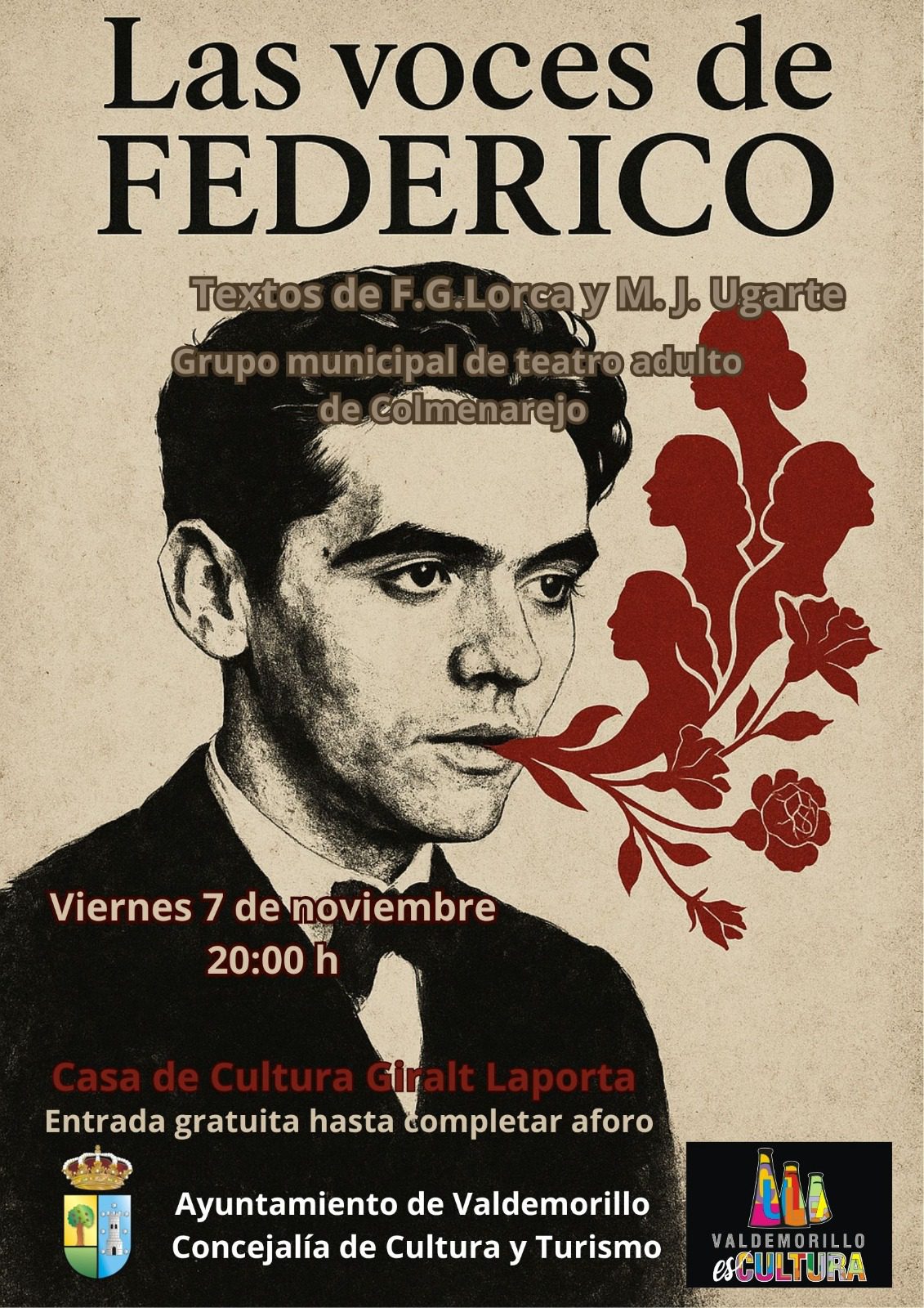 La profesora de teatro de las Escuelas Municipales de Valdemorillo y Colmenarejo, María Jesús Ugarte, actriz desde finales de los 80, pone también su firma a algunos de los textos que sirven para dar contenido a ‘Las voces de Federico’ que se van a elevar bajo los focos de la Casa de Cultura Giralt Laporta en un espectáculo que toma igualmente las palabras del poeto y dramaturgo de la Generación del 27. Una suma de textos que cobrarán vida así en un formato pensado para mostrar, en clave de homenaje, una singular combinación de escenas icónicas de su obra con los recuerdos imaginados por la madre, hermanas y amigas del escritor granadino.