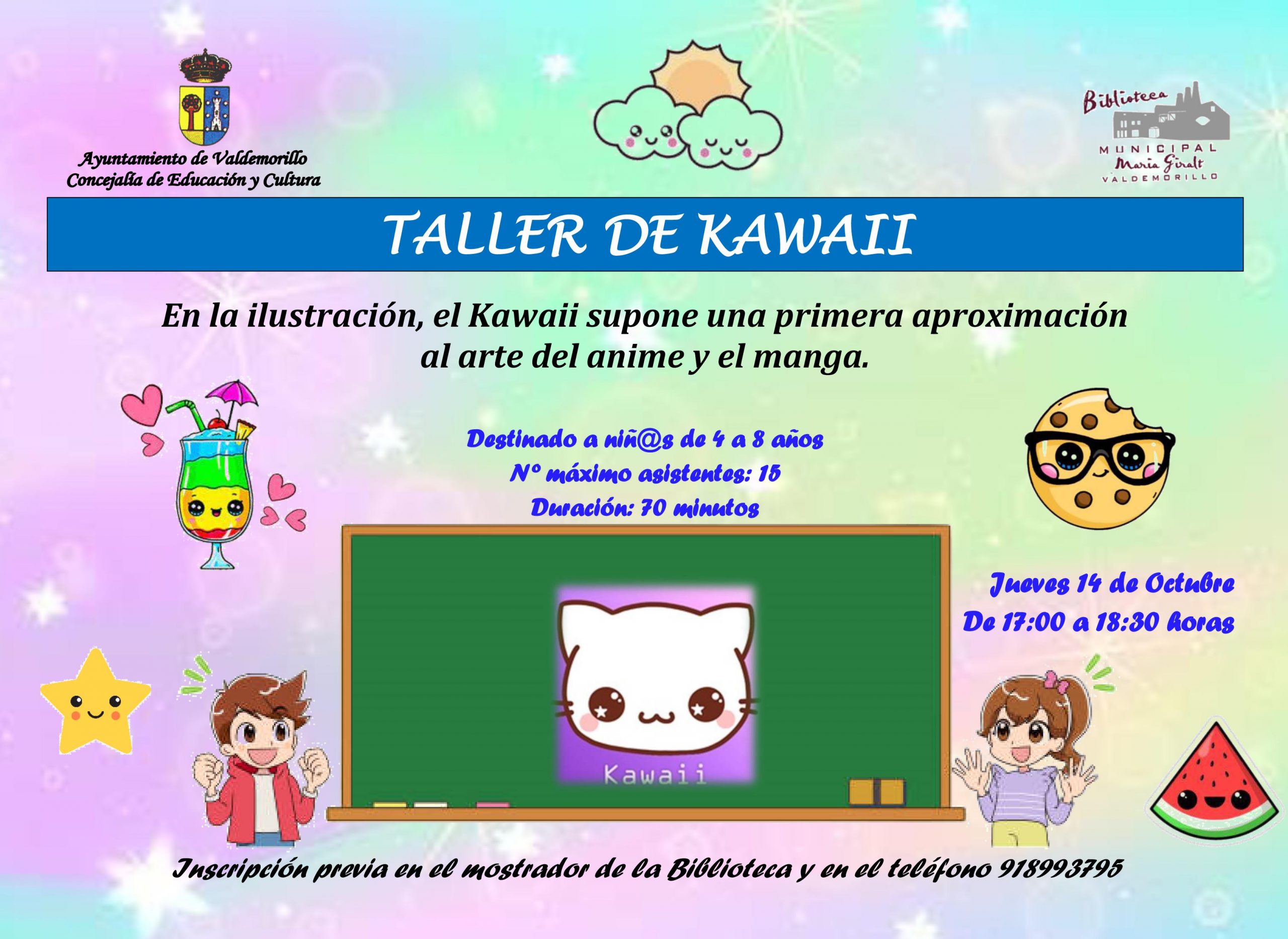 Programados los dos para el 14 de octubre, en el primero de estos talleres, el de Kawaii, se contará con los participantes de menos edad, de entre 4 y 8 años. Desarrollándose desde las 17,00 a las 18,30 horas, en esta sesión se abordará este tipo de ilustración, de estética infantil y colorista, mostrando el papel que cobra como una primera aproximación al arte del anime y el manga.