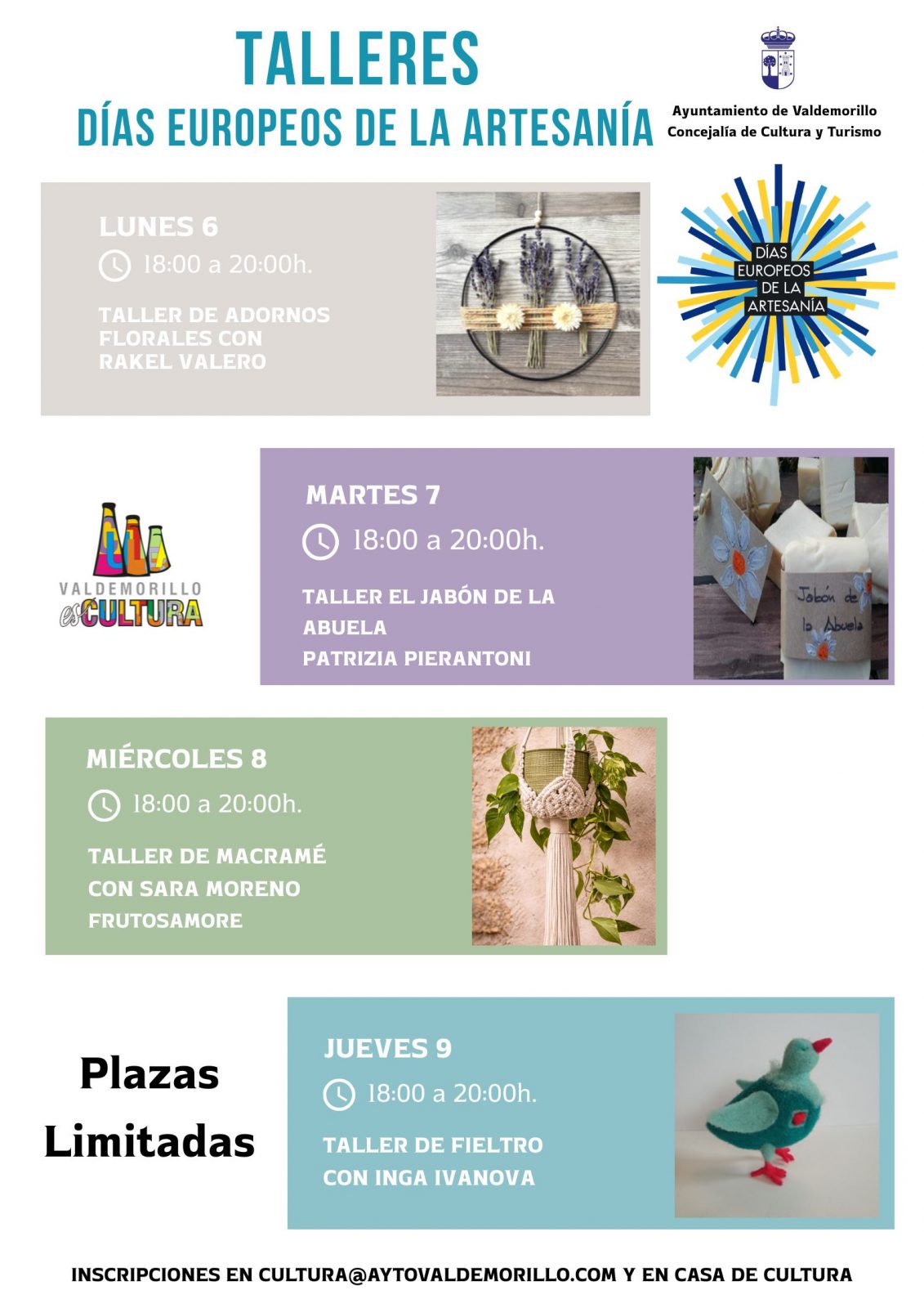 Valdemorillo se anticipa en una jornada a la propia agenda cultural europea que del 7 al 12 de abril volverá a ocupar un lugar central con la celebración de los Días Europeos de la Artesanía. Y será desde este lunes cuando comience a desarrollarse el programa especial elaborado por la concejalía de Cultura y Turismo para que este municipio se sume a la iniciativa que tanto contribuye a dar visibilidad a la labor y el talento de los artesanos de pueblos y ciudades de toda Europa. De hecho, son cuatro las artesanas locales encargadas de impartir los talleres gratuitos que van a facilitar a los vecinos que ellos también se pongan, literalmente, manos a la obra, descubriendo así “el arte de crear con las manos y el corazón”, como indica Victoria Gil, concejal del área.