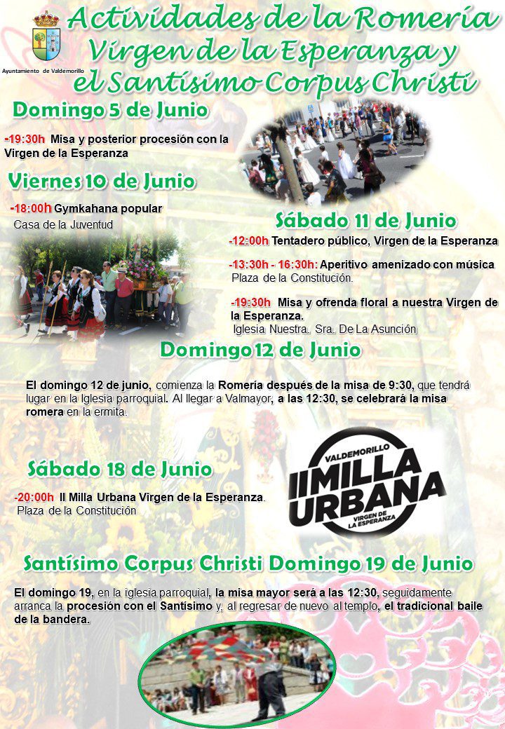 En cuanto al día grande por excelencia en este junio de 2022 para la población valdemorillense, el domingo 12 de junio traerá de nuevo los sones y el espléndido ambiente que enmarcan la Romería local, que dará comienzo al término de la misa de las 9:30 h, marchando a partir de ese instante los participantes a pie, y muchos bailando a tramos el rondón, para formar una comitiva en la que tampoco faltarán los jinetes a caballo y algún vehículo engalanado. Una vez completado el recorrido desde el casco urbano a la ermita de Valmayor, será allí donde se oficie otra misa a las 12,30 h.
